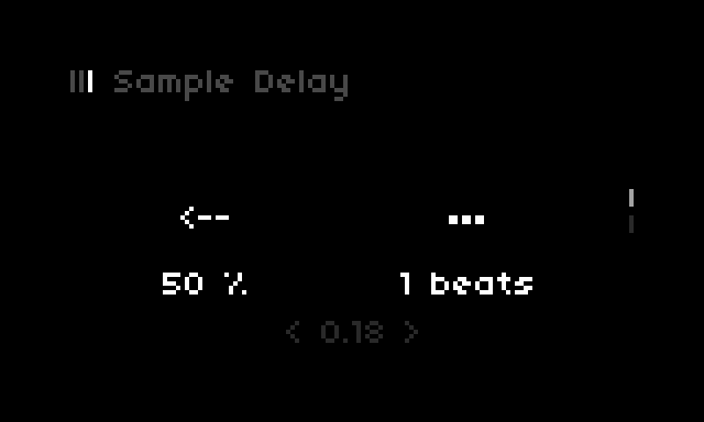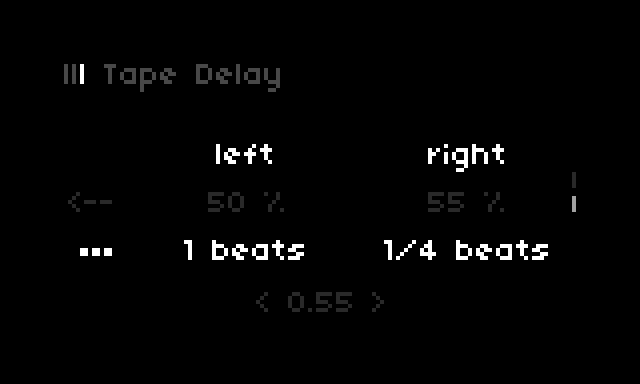 Both sample and tape have their own independent delay functionalities. The sample side uses a SuperCollider delay bus in the Timber engine, and tape uses softcut. Both delay times are synced to the internal CLOCK using the same clock_fraction options as the sequencer (see below).