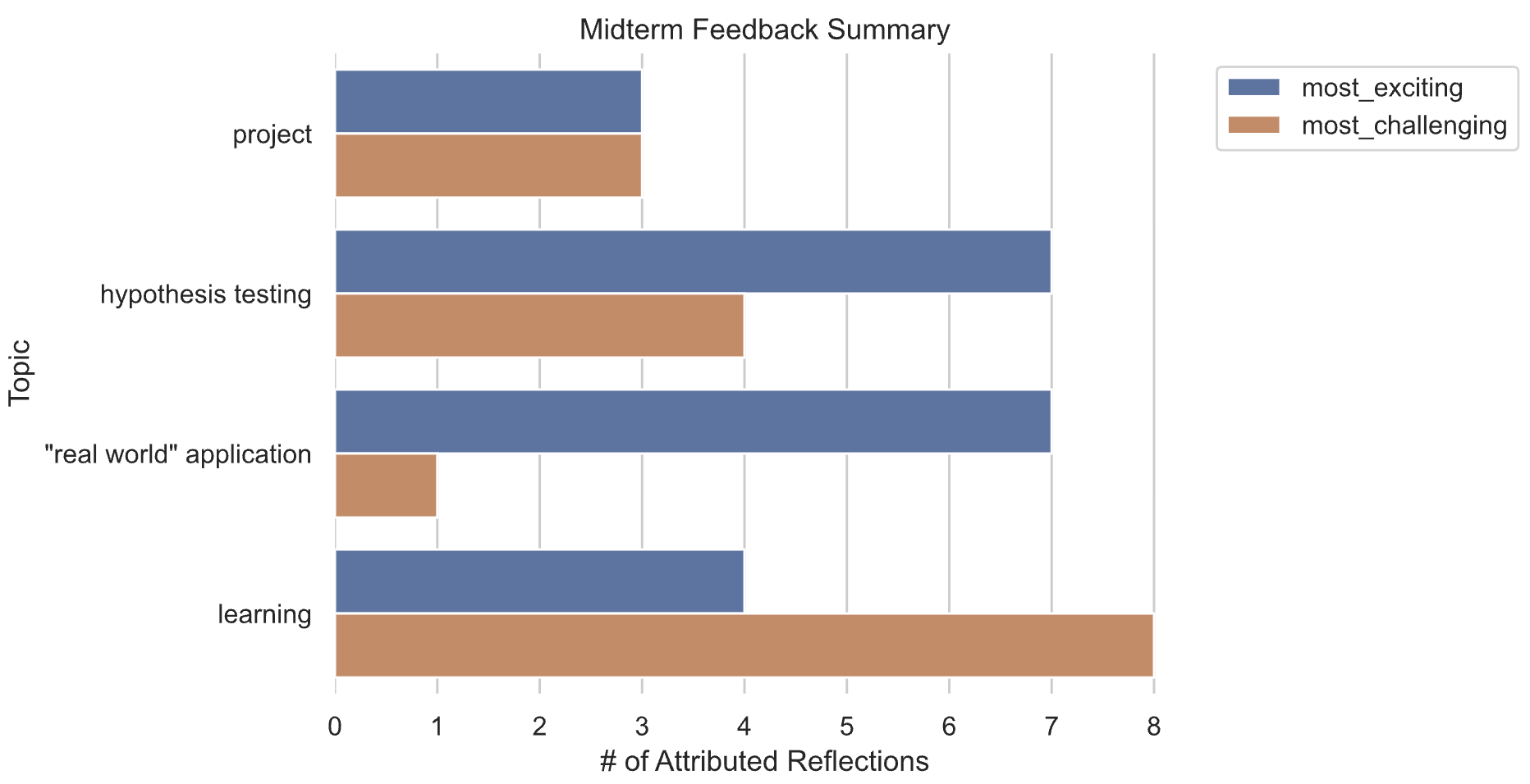 That said, like the metacognitive reports, I will share an (anonymized) summary of the responses. For example, here is a chart I shared with my statistics class in Spring 2025, outlining the topics that were apparently most exciting and challenging to students: